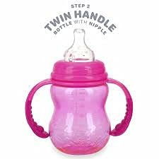 Nuby 3-Stage Wide Neck No Spill Bottle with Handles and Non-Drip Juice Spout, 3 Months, 8 Ounce, Pink