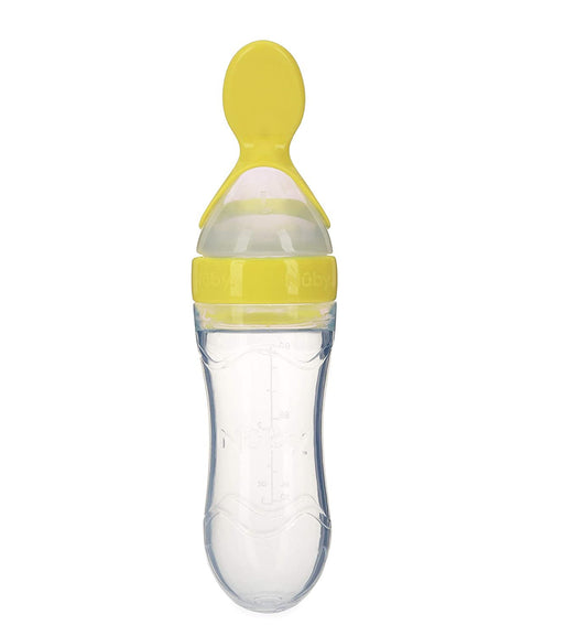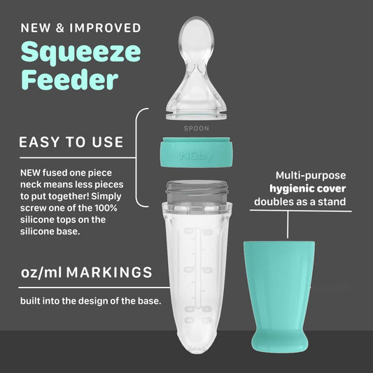 Nuby New & Improved Silicone Food Dispensing Squeeze Feeder with Cover & Stand, 4+ Months/ 3 Oz/ 90 Ml, Colors Vary: Blue, Pink, Green