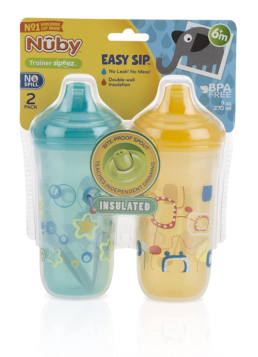 Nuby No-Spill Insulated Hard Spout 9 oz Cup, 2 Count Aqua/Yellow