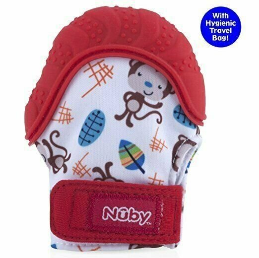 Nuby Soothing Teething Mitten with Hygienic Travel Bag, Red Monkey, 1 Count