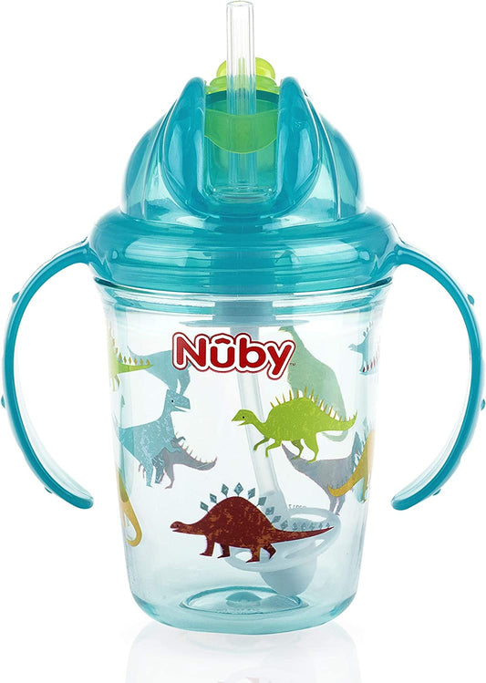 Nuby Tritan No Spill Flip N' Sip Twin Handle Printed Cup with 360 Weighted Straw (Aqua, Jurassic Origami)