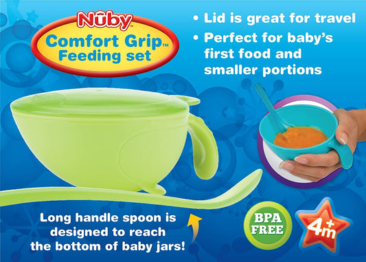Nuby, Non-Skid Comfort Grip Baby Food Plastic Feeding Bowl with Lid and Spoon, Colors May Vary