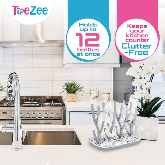 ToeZee Baby Bottle Drying Rack Space Saving Countertop Baby Bottle Holder, Drying Rack for Baby Bottles Accessories - Stores Up to 12 Bottles, Dishwasher Safe (Gray)