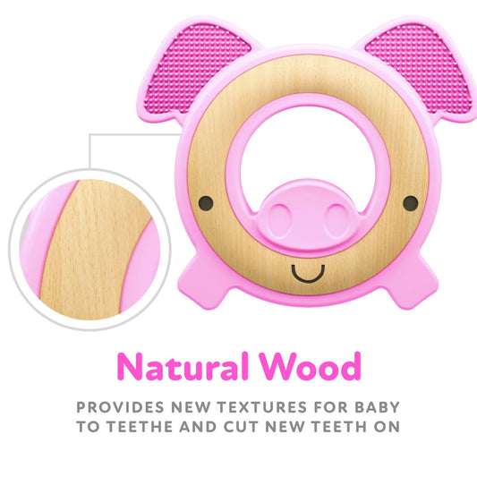 Nuby Natural Wood & Silicone Teether: Pig, 3M+, Pink (80803)