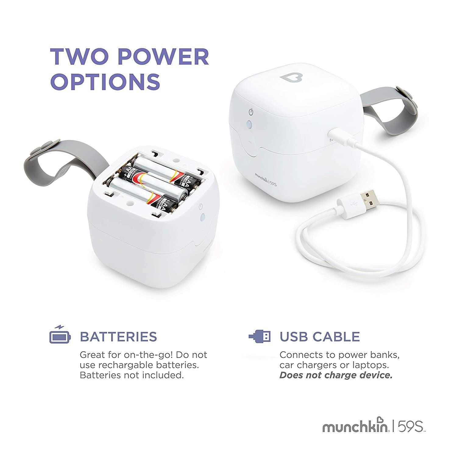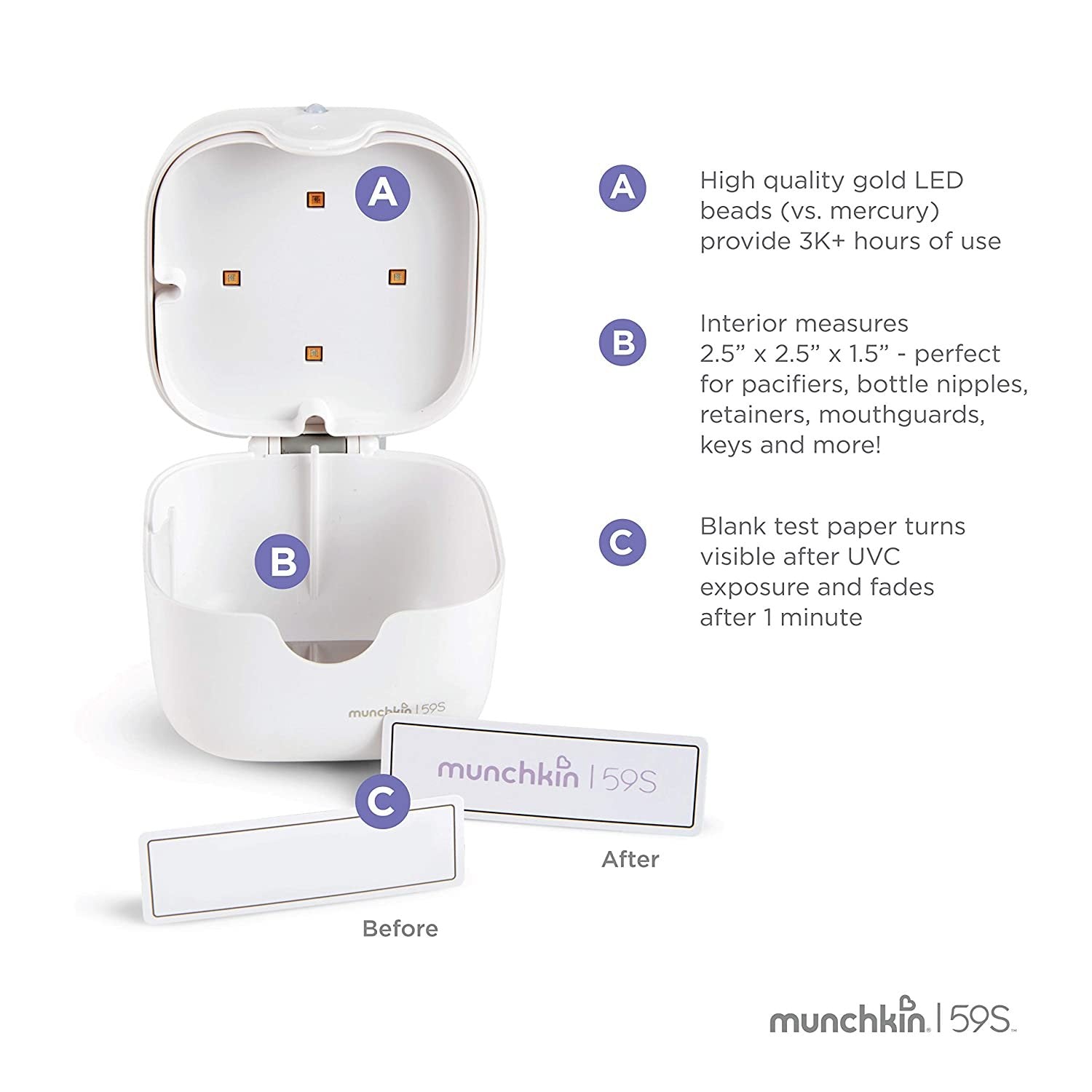 Babies drop things in dirty places at the worst times. This portable UV-C sterilizer sanitizes pacifiers, bottle nipples, and more in under a minute so you can be on your way anywhere. The Mini Sterilizer safely eliminates 99.9% of germs using just UV light and has been tested by independent labs. No chemicals, heat, or water needed! The Mini Sterilizer's 4 gold-plated UV LED lights are mercury and ozone free and auto shuts-off when the lid is opened. This small device is easy to throw into (or attach to) a purse or diaper bag, so when you need it, it's right at hand. Perfect for use in the home, but extra handy for public spaces such as daycare, playgrounds, doctor's offices, airports, and more! UV light is a safe and proven method of killing bacteria that is used by hospitals to sanitize everything from operating rooms to surgical equipment. Munchkin has partnered with 59 S, the leader in UV LED technology, to develop convenient, UV-based sanitizing solutions that help families with young children lead healthier lives. A note on safety: Rest assured that our product has undergone rigorous testing through multiple independent labs to ensure efficacy. We’ve tested pacifiers, teethers, mouth guards, and more to verify that our UV light sterilizers remove up to 99.99% of germs, viruses and bacteria on those items. We are also EPA and FDA registered as well as UL Safety Certified.